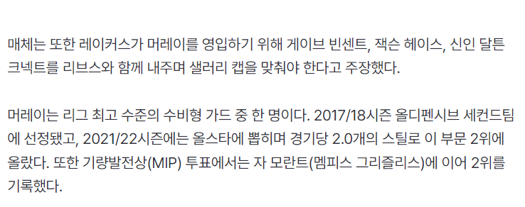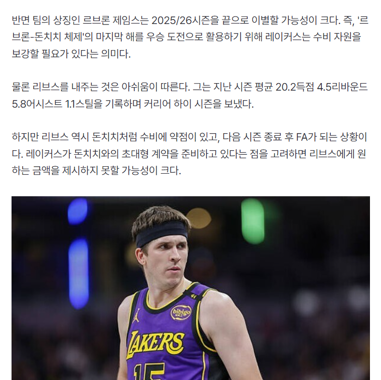 文中还写道,东契奇刚刚与湖人签下三年1.65亿的提前续约合同,之后他会跟湖人达成4.17亿的超级顶薪续约,湖人根本没有金钱来满足里夫斯均薪超过3000万的合约,所以将他打包送走换穆雷是最好的选择,里夫斯的软肋是身体硬度不足+防守差,他其实并不适合与东契奇搭档。