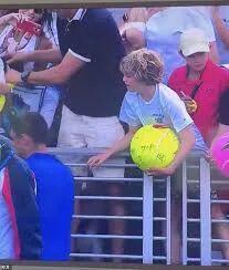 镜头捕捉到的画面令人动容:Majchrzak先是在网球上签下名字,而后摘掉帽子,径直递给在他正前方观众席上的白衣服男孩。小男孩兴奋地伸手,差一点就能触碰到偶像的礼物。